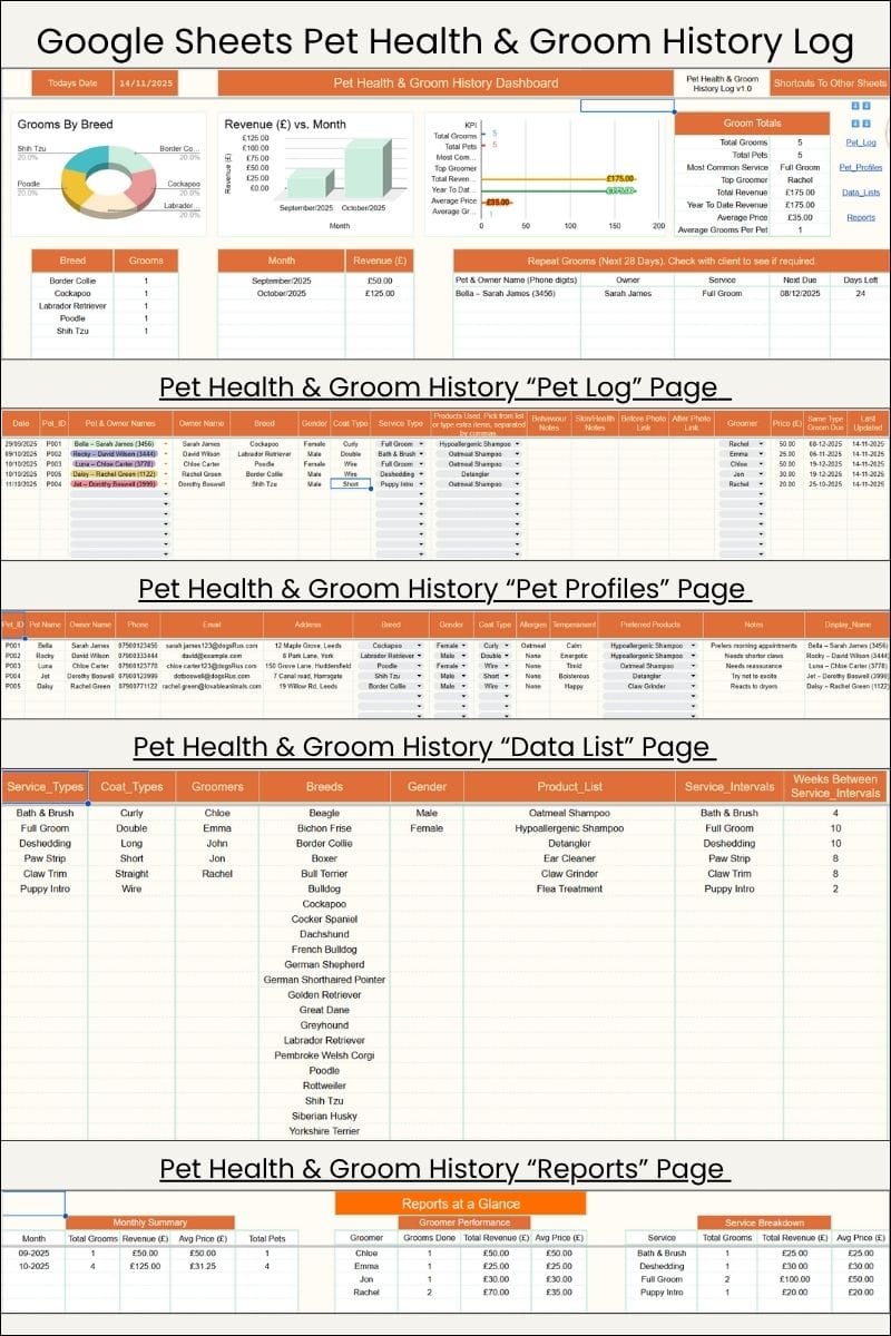 A Google Sheets tool for recording grooming routines and health notes in one organised place.